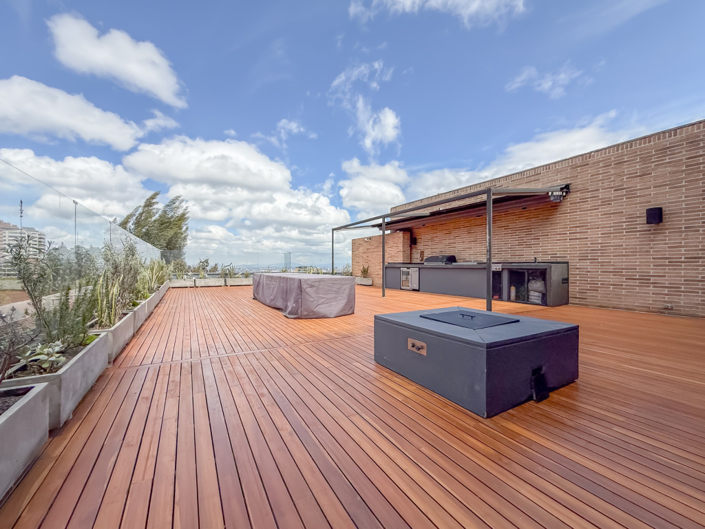 Las terrazas, que suman 250 m², están diseñadas para el disfrute al aire libre con múltiples ambientes: zona de BBQ, plancha Teppanyaki, fire pit, y una impresionante mesa en piedra de río, perfectas para compartir momentos especiales con familiares y amigos.