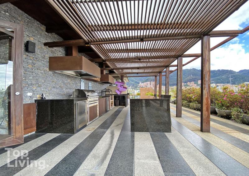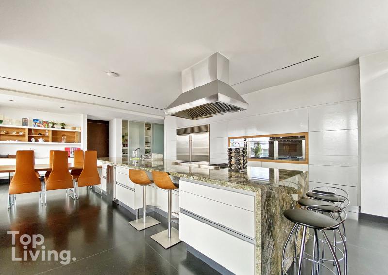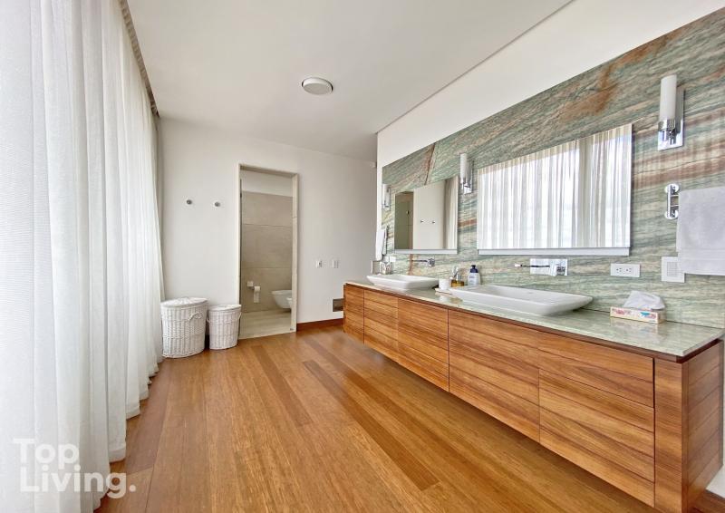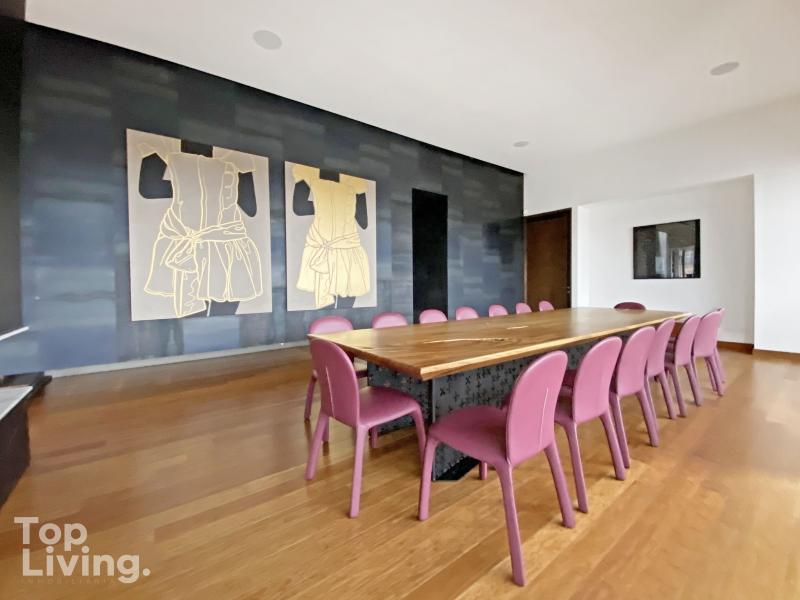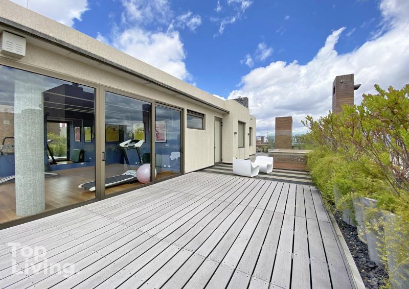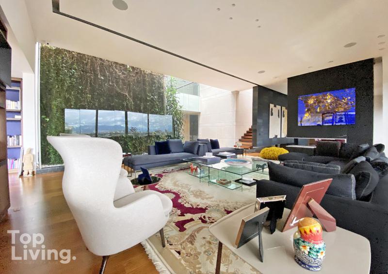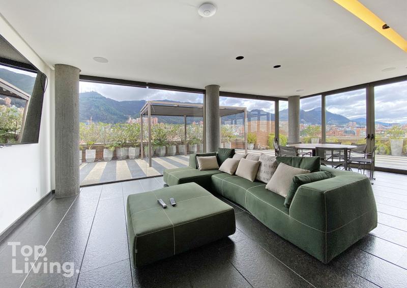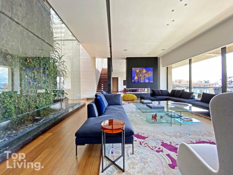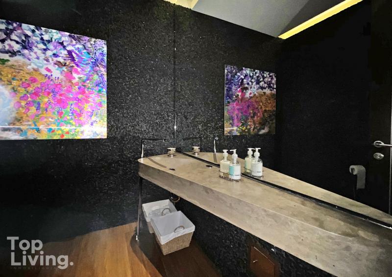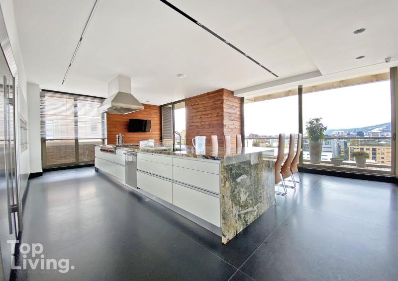 Maravilloso Penthouse con exclusivo diseño y vista 360. Es un apartamento con un área aproximada de 1.550 m2 distribuidos en dos plantas. La planta baja aloja el salón principal con grandes ventanales que disfruta no solo de la vista y luz natural, sino de la presencia de un jardín vertical hidropónico, el comedor con pared flotante y recubierta de láminas de hierro crudo con costuras internas, oficina privada y la zona de servicio. Tiene además un elemento arquitectónico muy importante, un muro de piedra, que organiza los espacios en torno a él tanto horizontal como verticalmente, otorgando la privacidad necesaria en la zona de habitaciones. La planta alta, con terrazas y vista de 360º, presenta los espacios sociales más importantes: Pérgola de BBQ, horno de pizza, sala de juegos infantiles, salón de juegos y TV, gimnasio, habitación de huéspedes y un putting green.