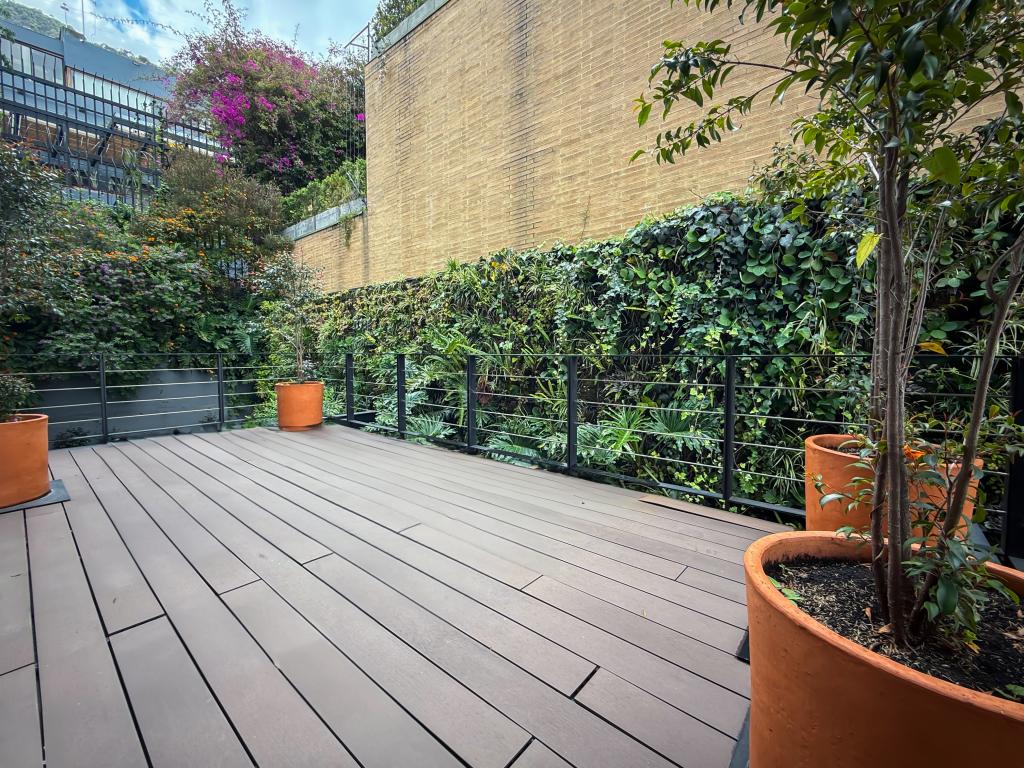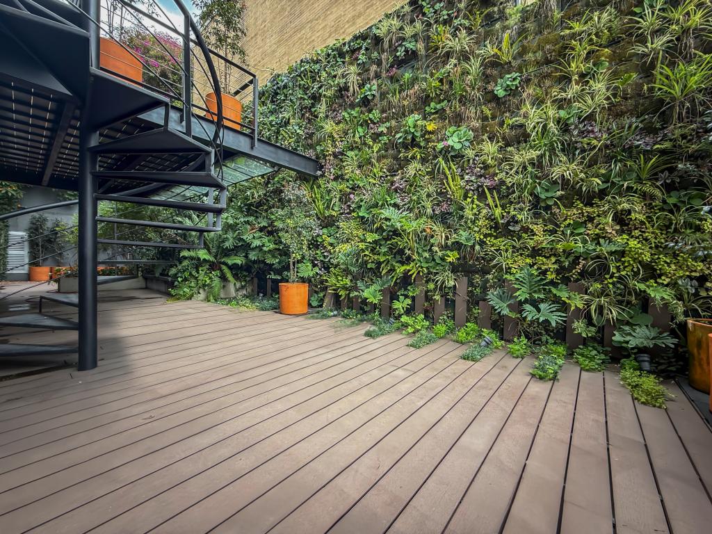 En la zona social encontramos una amplia terraza con escaleras de caracol que comunican con el piso de abajo.