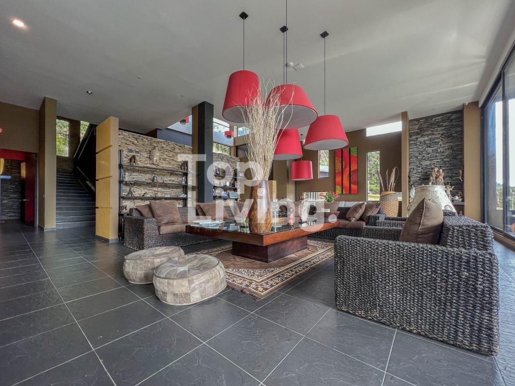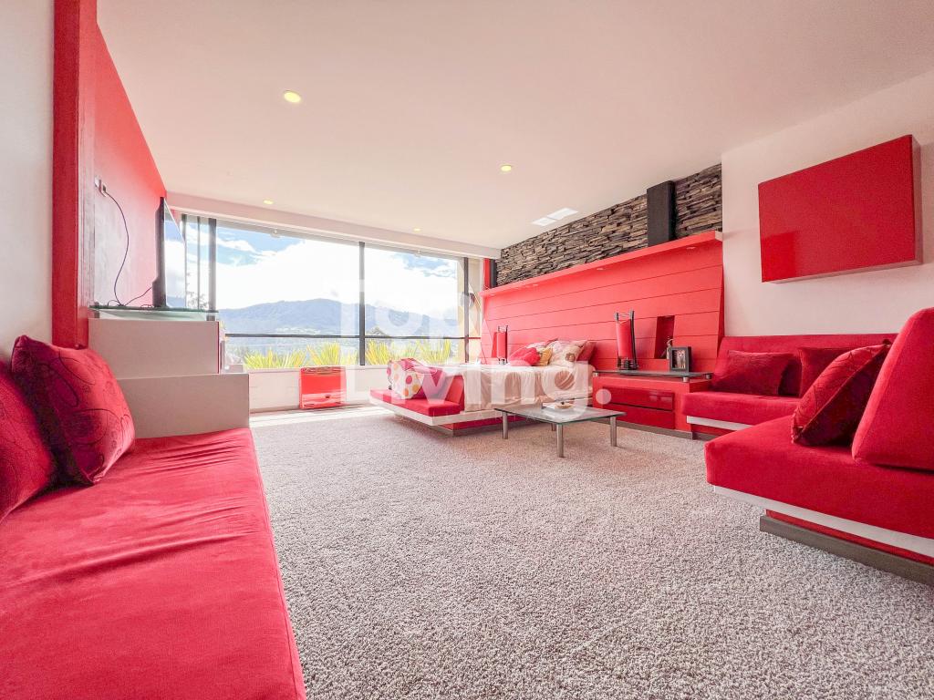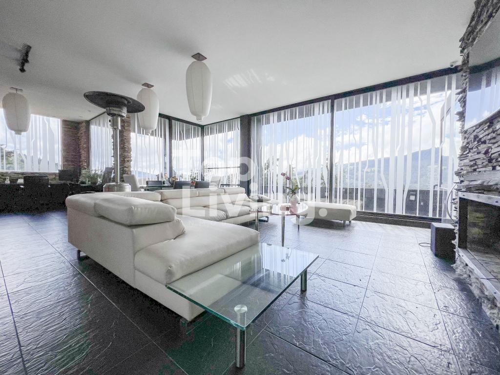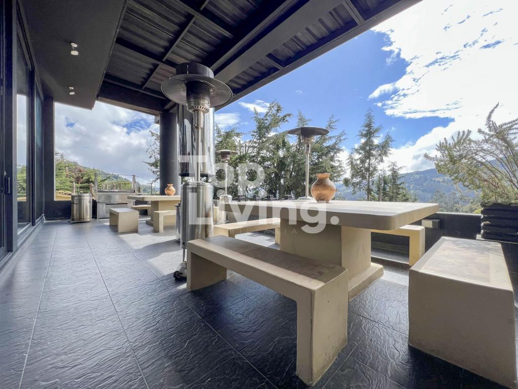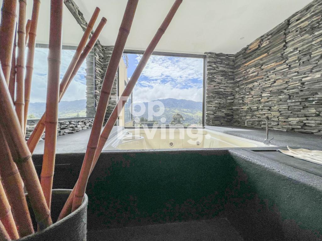 Al ingresar a través de un gran hall hay una amplia sala con grandes ventanales, chimenea y otra sola con acceso a una terraza con hermosa vista. Luego encontramos un comedor independiente de gran tamaño y sala auxiliar. La cocina es moderna y grande. En el mismo piso, ingresando por la cocina o por el pasillo principal, hay un salón de juegos de dos niveles, con sala, chimenea, un salón de billar, bar y un baño. En el segundo piso hay dos cuartos cada uno muy grande con baño en suite y una vista increíble a las montañas; saliendo de las habitaciones y en el mismo nivel hay: un baño turco, un sauna, una piscina y un espacio grande adecuado para máquinas de gimnasio, también hay baño y ducha para estas zonas húmedas. Subimos, al tercer piso en donde está la habitación principal muy extensa con baño en suite y walk - in closet, terraza cubierta y saliendo de esta una sala y cocina auxiliar y chimenea de leña. Toda la casa y habitaciones tiene una vista increíble a las montañas.