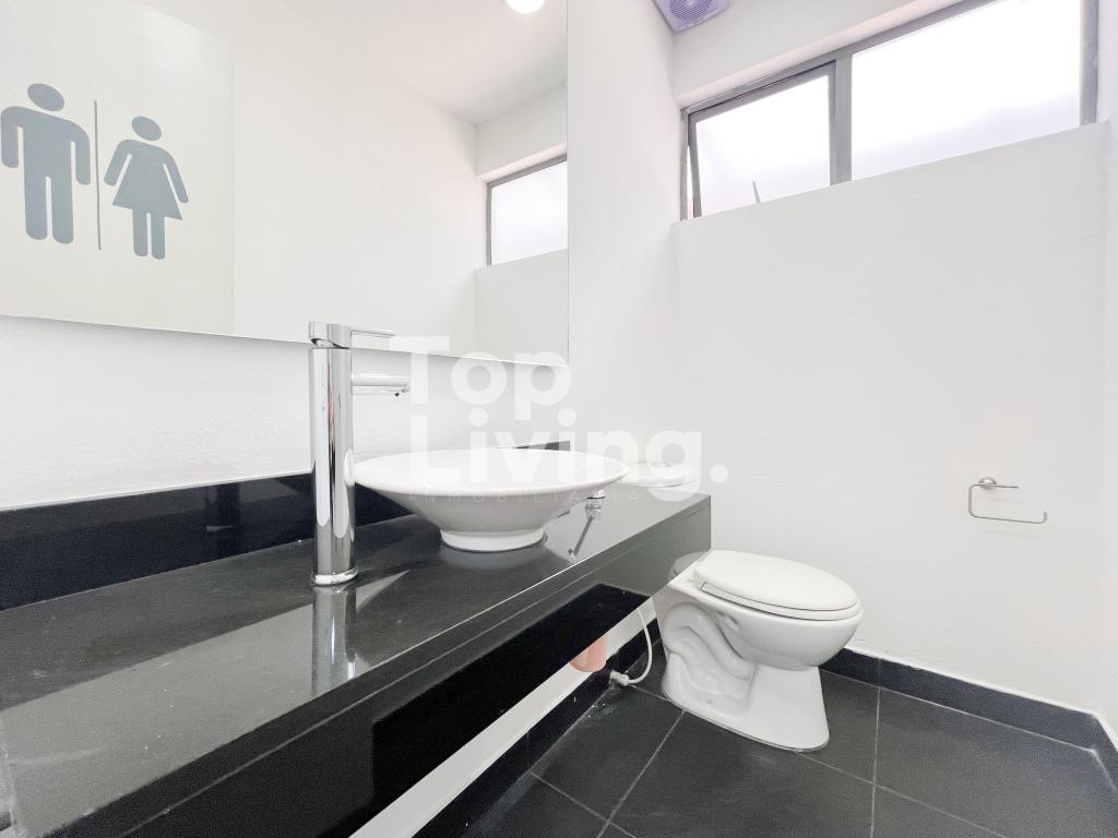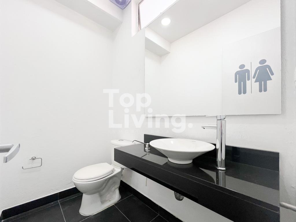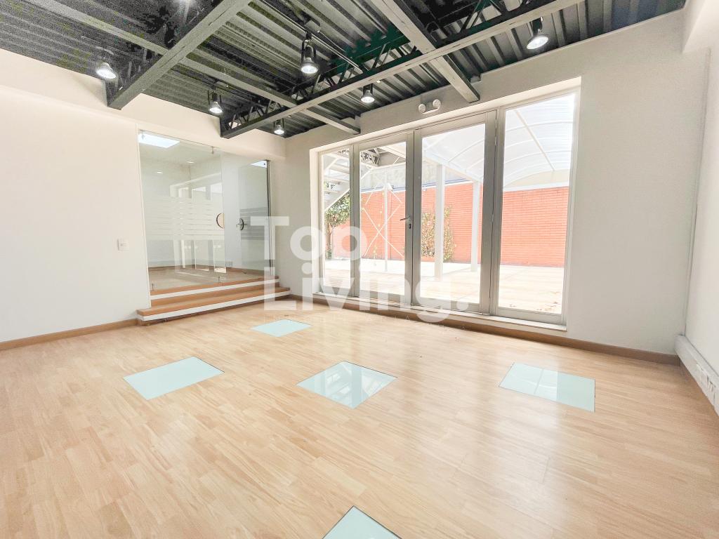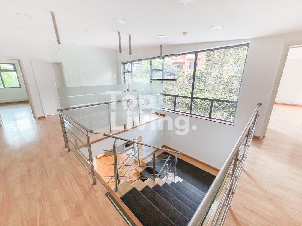 Espectacular oficina con area construida 552 m2, área libre entre jardines y parqueaderos 407 m2. Área total 959 m² Dos pisos, dos escaleras, once zonas de oficina cerrada, tres de esas con baño interno, cinco baños, tres espacios muy amplios para puestos de trabajo, cafetería y cuarto de sistemas. Primer piso: Jardín, parqueaderos, caseta de vigilancia, terraza, dos baños exteriores, espacio de recepción con oficinas cerradas a la derecha, baño de visitantes, sala de juntas, dos oficinas cerradas con baño y zona amplia para puestos de trabajo. Segundo piso: seis oficinas cerradas, una de esas con baño, dos baños, dos zonas para puestos de trabajo, cocineta y cuarto de sistemas.