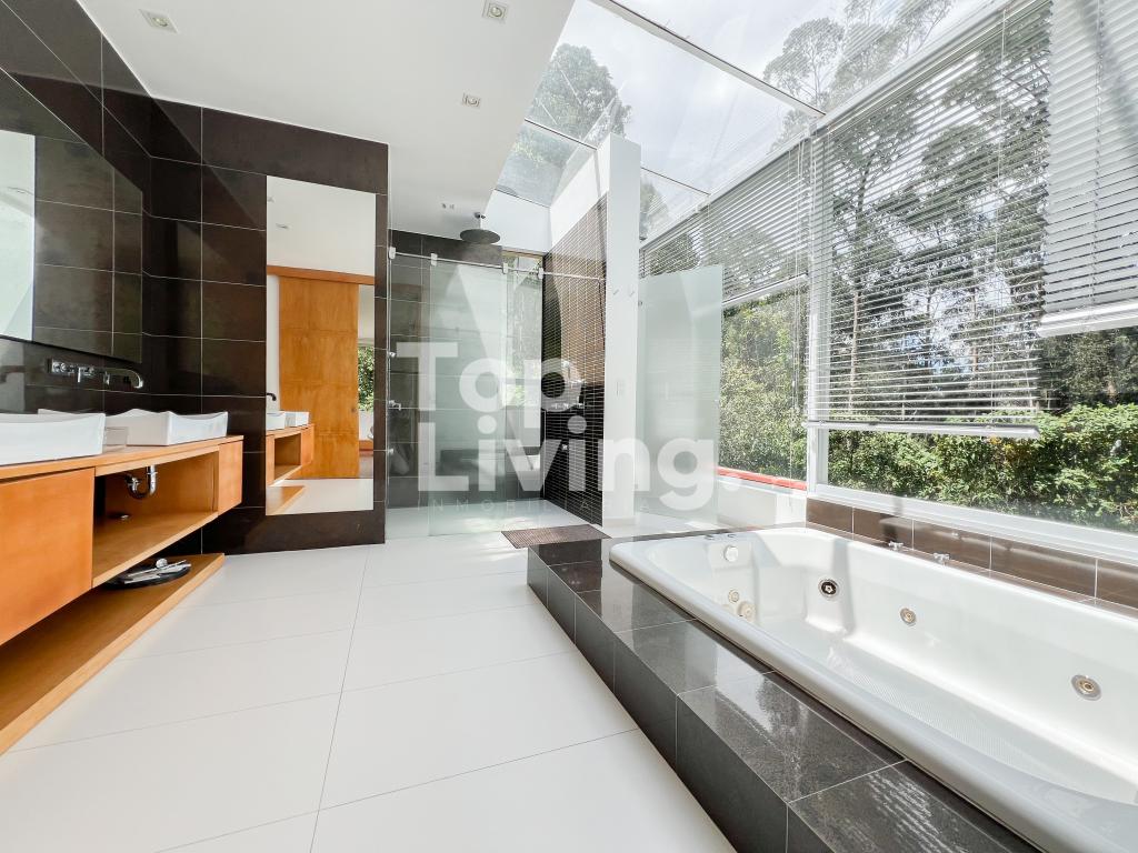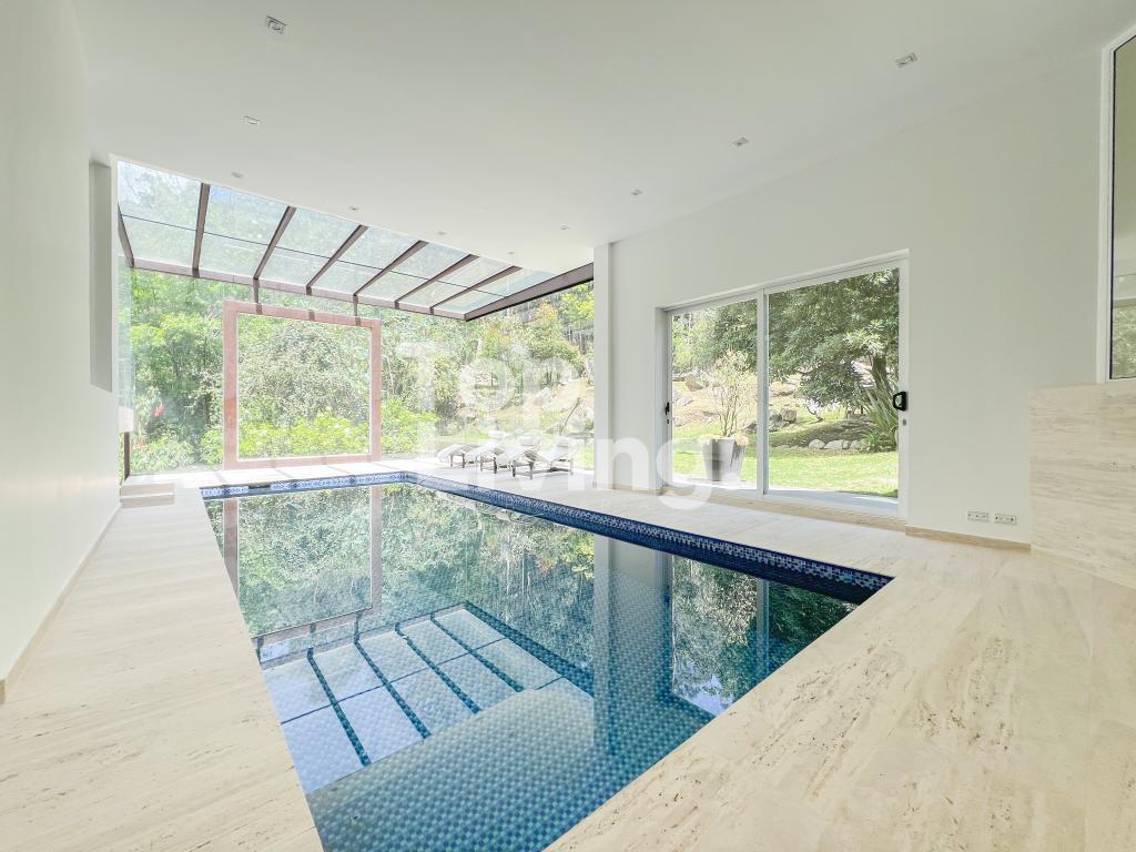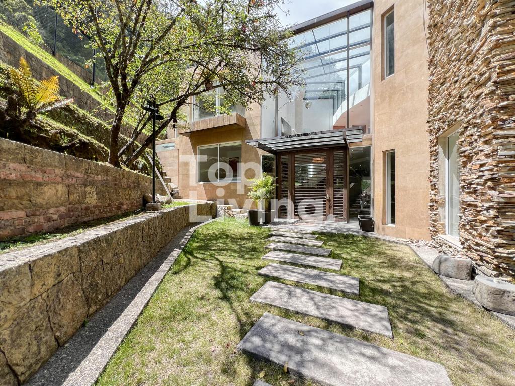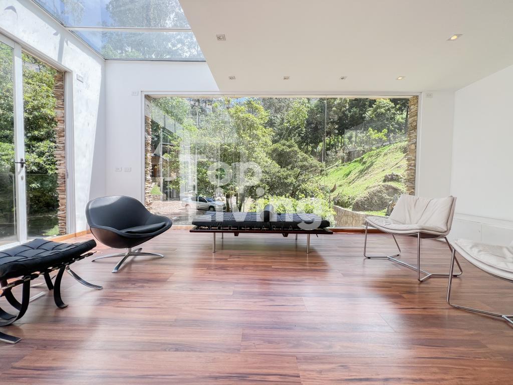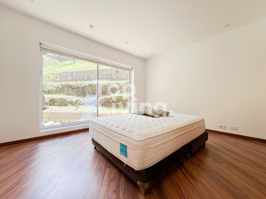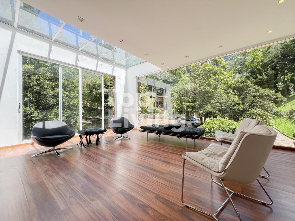 Bellísima casa ubicada en Rosales con todo lo que podamos soñar. Al entrar en la espectacular casa encontramos maravillosos espacios con ventanales de piso a techo, una amplia sala con vistas al jardín y un gran comedor independiente. La cocina es integral, moderna, funcional, completamente equipada con electrodomésticos de alta gama, con comedor auxiliar y zona de lavandería independiente. Todos los espacios se integran armoniosamente con una grandiosa piscina climatizada con sauna, turco y un espacio para gimnasio. En el piso superior encontramos un family room, tres habitaciones con baño en suite; la habitación principal con su walk-in closet. Cuenta con casa para el servicio y guest house en forma de cabaña totalmente dotada con cocina tipo americana y dos dormitorios. Adicionalmente tenemos tres pesebreras, cancha de tenis y espacio verde con quebrada y un sendero privado a los cerros.