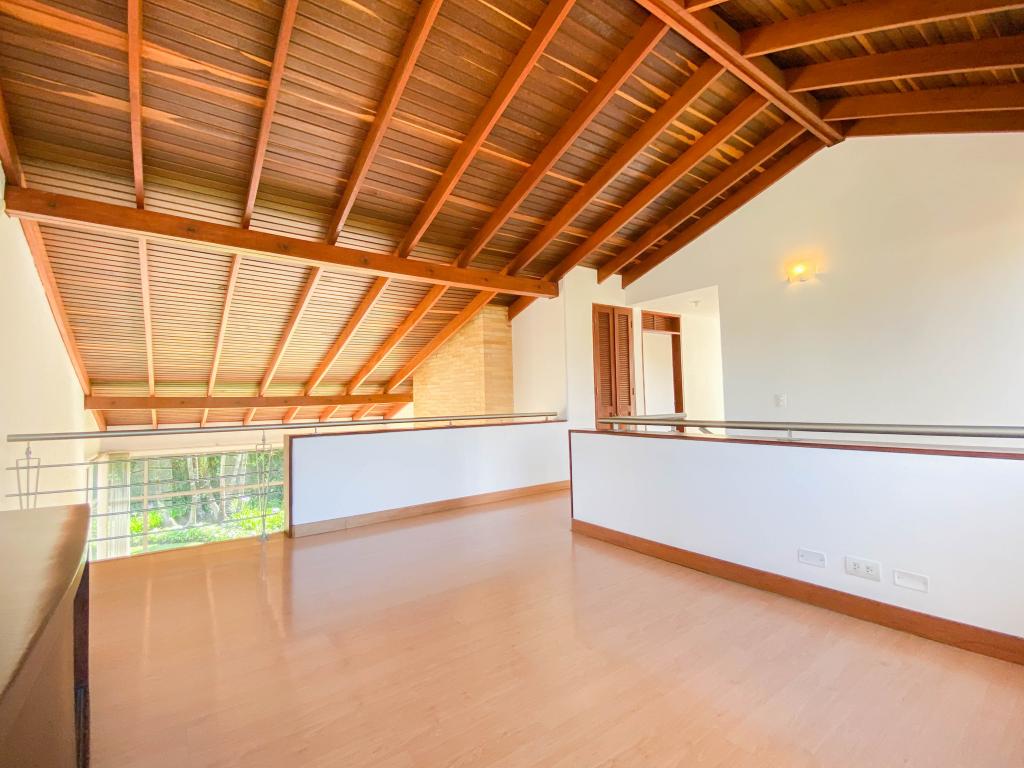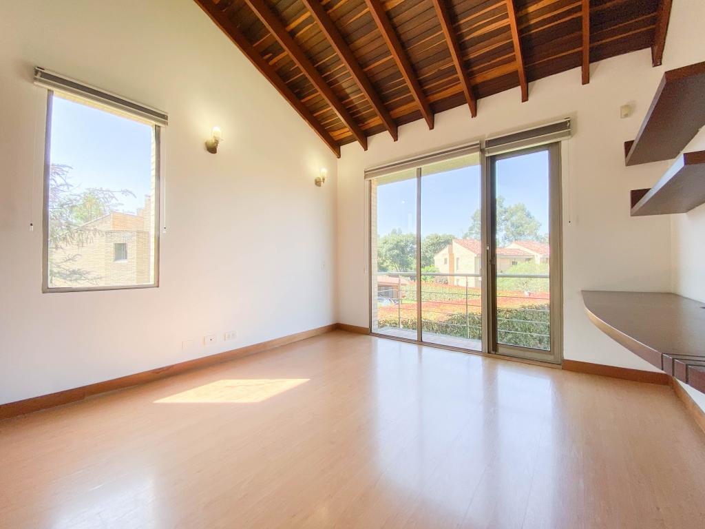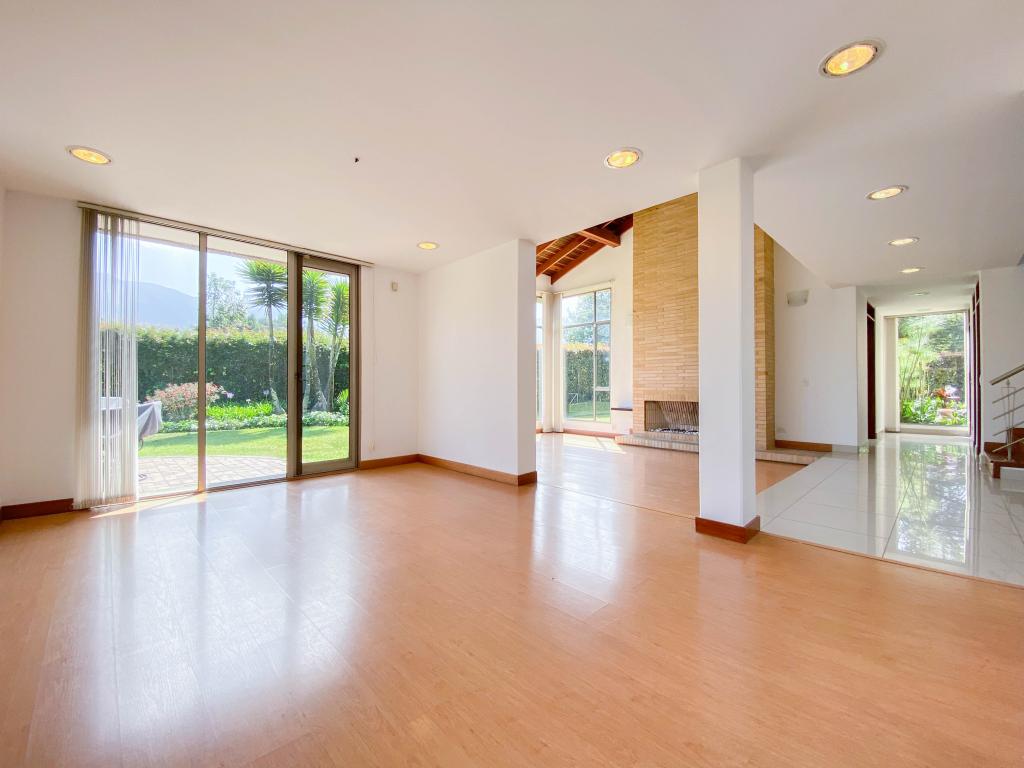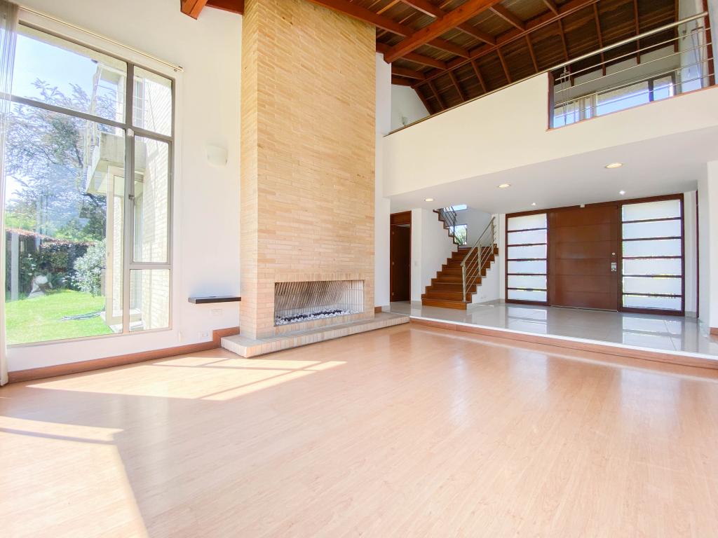 Al ingresar a esta espectacular casa nos encontramos un gran área con amplitud e iluminación. En el primer piso con una sala amplia con ventanales de piso a techo y chimenea a gas, amplio comedor independiente y una agradable zona de BBQ exterior con muebles importados. La terraza es un espacio amplio con conexión de gas para instalar calefactores, que hacen que se pueda utilizar en los días fríos de la sabana . La casa cuenta con 4 habitaciones, 3 con baño en suite, balcón y se encuentran ubicadas en el segundo piso junto al family room. La cuarta habitación está en el primer piso, donde también encontramos el estudio con chimenea a gas natural, y la zona de servicio que cuenta con una amplia cocina integral, cuarto y baño de servicio, así como un mueble amplio para depósito.
