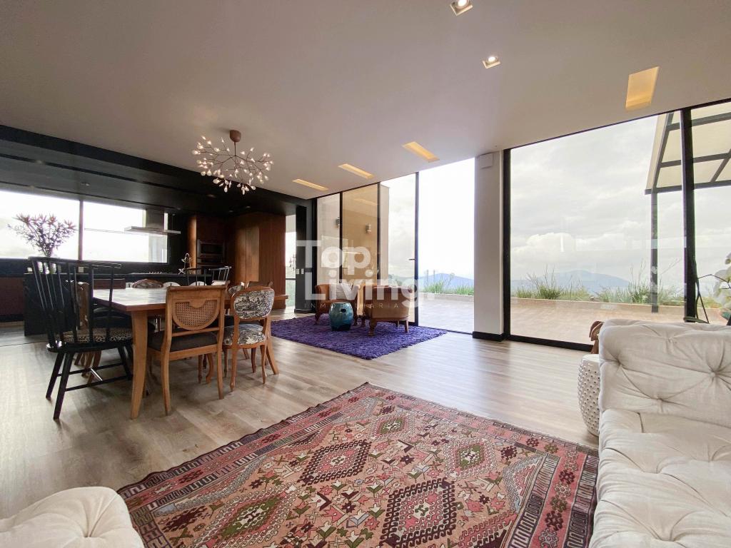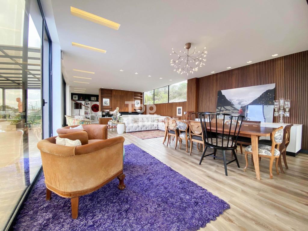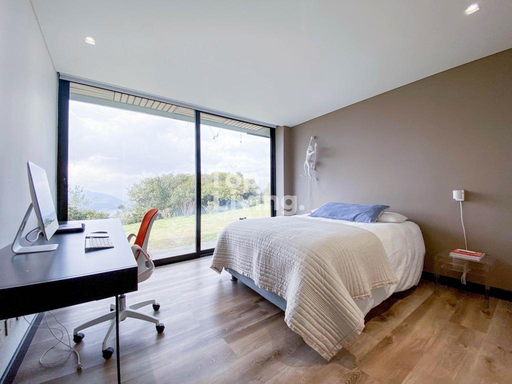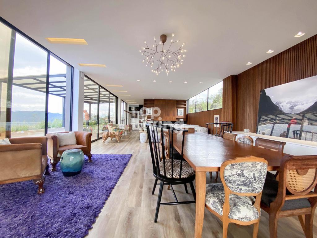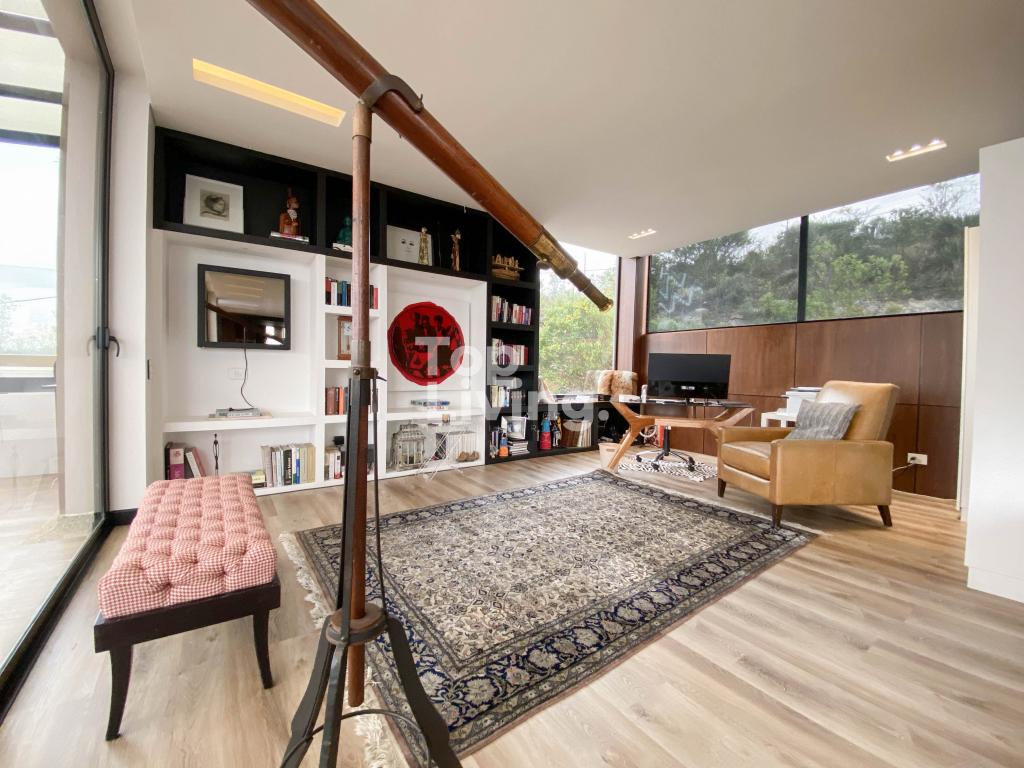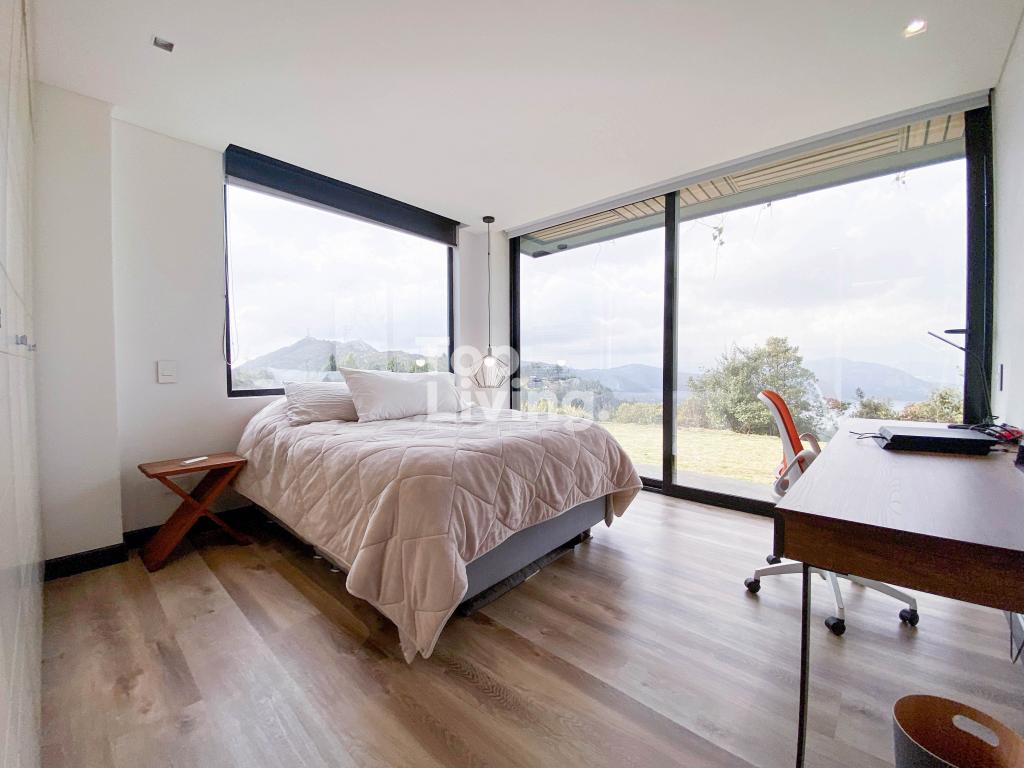 Espectacular casa para arriendo y venta vía La Calera. Al llegar a la propiedad encontramos un espacio con mucha vegetación, vista premium al embalse de San Rafael y montañas que circundan, así como vista a Bogotá. Al ingresar a la casa nos recibe un hall muy iluminado con grandes ventanales, al subir tenemos una gran zona social con una sala-comedor en un solo espacio, chimenea a gas que nos conecta con acogedor estudio, toda esta área nos da acceso directo a una gran terraza de 150 mts con pérgola y zona de BBQ, desde acá la maravillosa vista al embalse completan esta zona. La cocina es moderna, tipo americana, funcional y con electrodomésticos de alta gama. Cuenta con zona de ropas independiente, cuarto y baño de servicio. Al bajar tenemos el área privada con un amplio hall de entrada y tres habitaciones con baño en suite, mucha iluminación y acceso a un gran jardín.