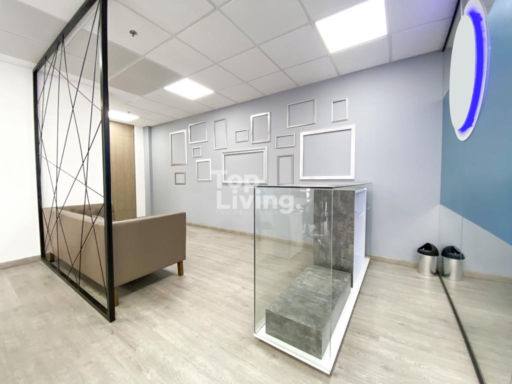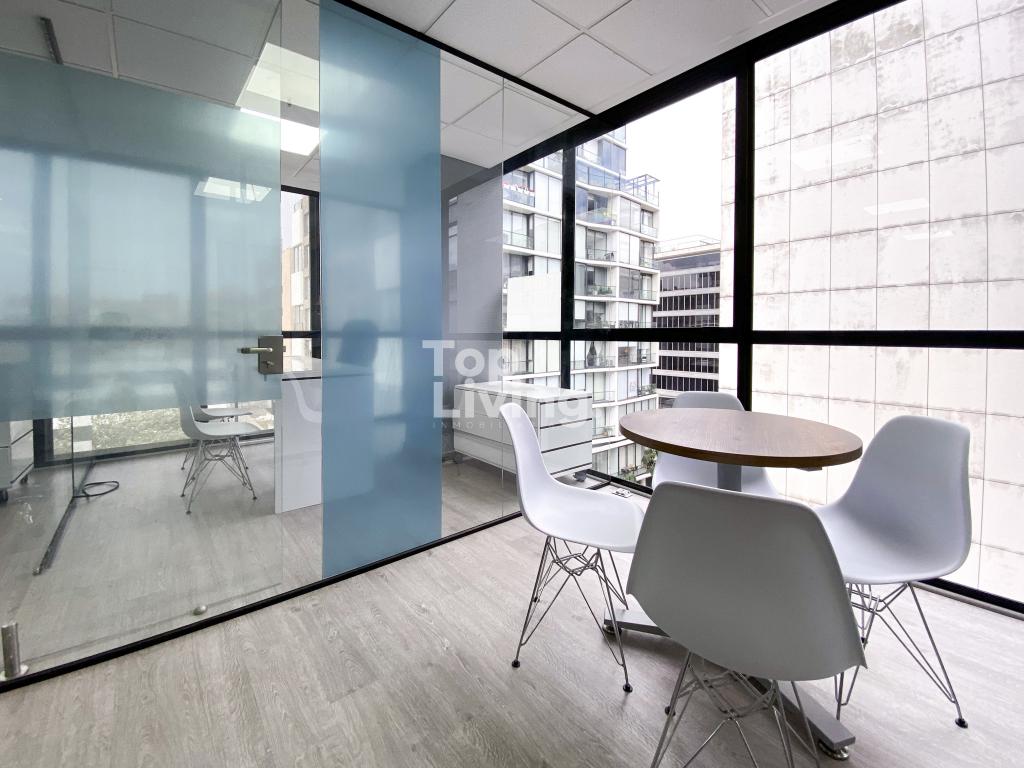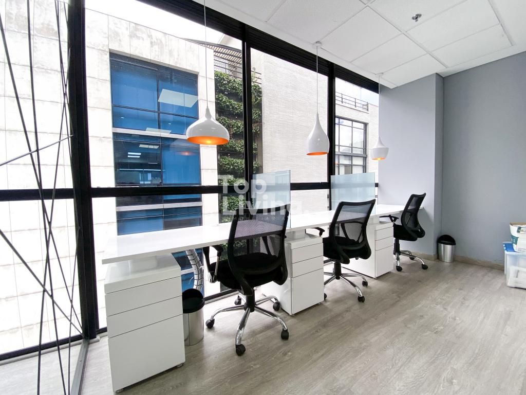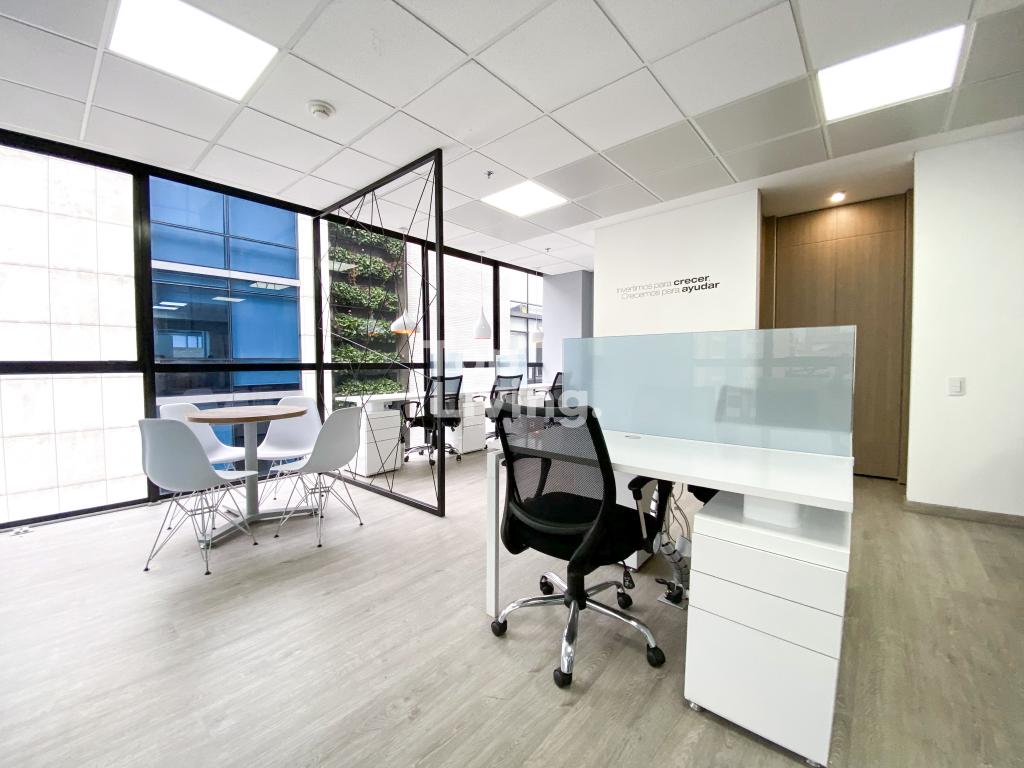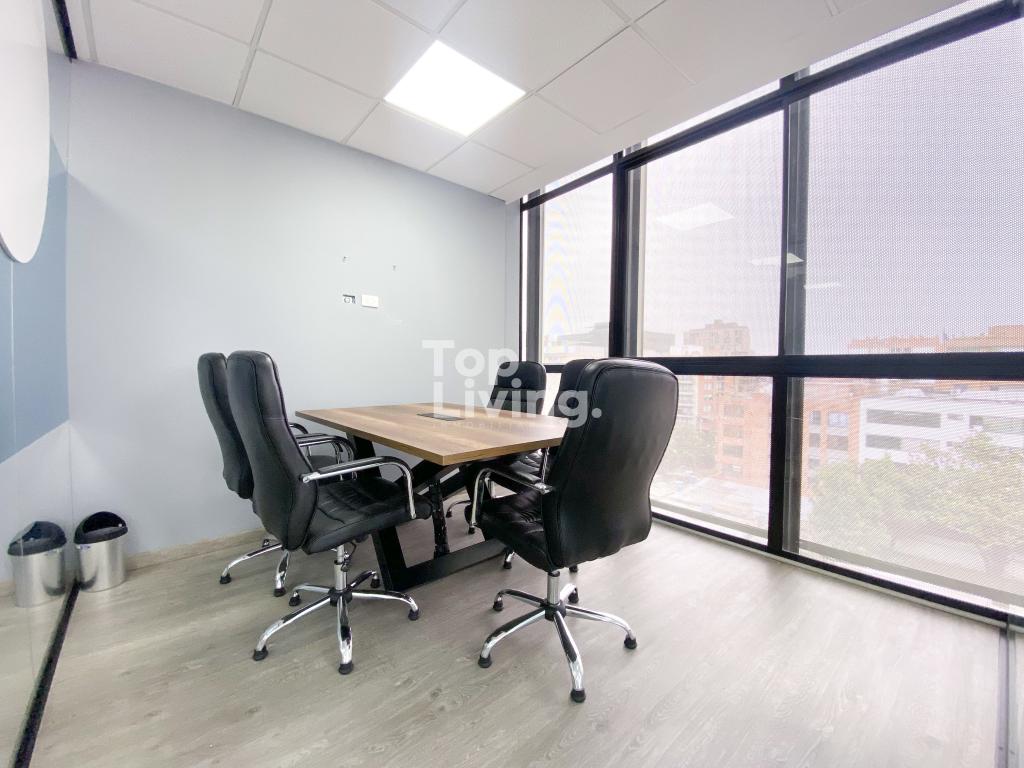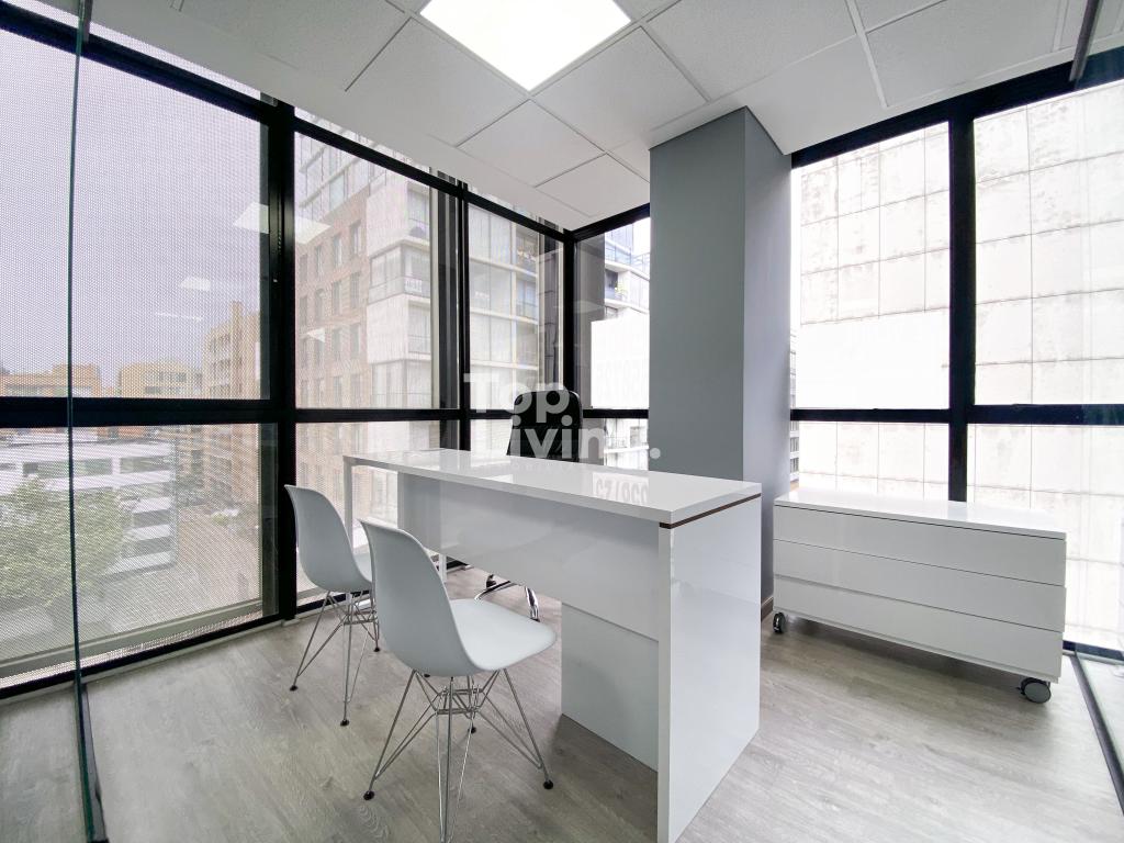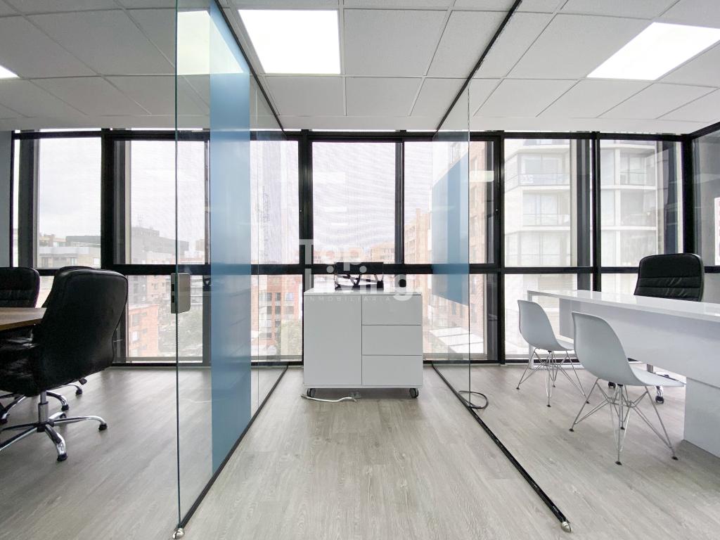 Oficina para venta o arriendo en Chicó. Espectacular oficina completamente amoblada con espacios divididos: oficina para gerencia, sala de juntas y espacios para varios puestos de trabajo, cocineta y baño privado. El edificio cuenta con terraza comunal, baños sociales en cada piso, 41 parqueaderos para visitantes. El precio no incluye IVA.